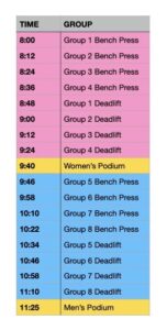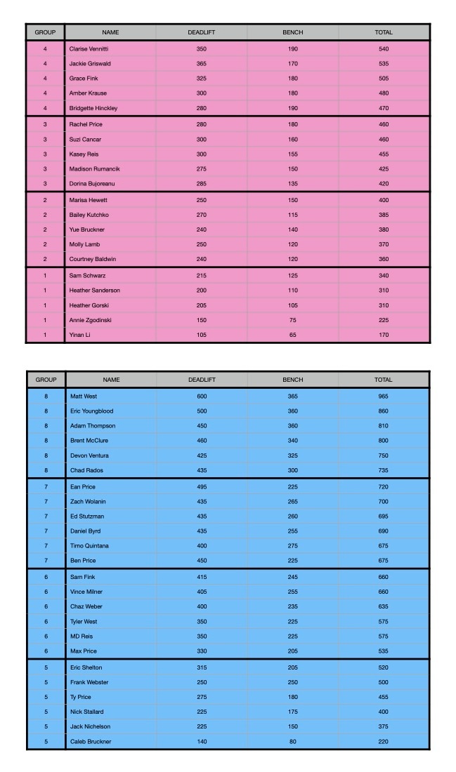 All lifters will have three attempts at a max bench press and three attempts at a max deadlift. For your bench press rep to count, you must complete the entire rep unassisted after you have received a lift out of the rack. The barbell must touch your shirt and return back to full extension before racking. Your glutes must remain in contact with the bench throughout the entire lift. Any loss of contact with the bench will disqualify that lift. For your deadlift, you will be allowed to use lifting straps in you want to. Please arrive at least 30 minutes before your group is scheduled to lift so you can warmup. When you arrive, please check-in at the scoring table to weigh in. Your weight will be factored into the Wilks Formula to determine the winner.